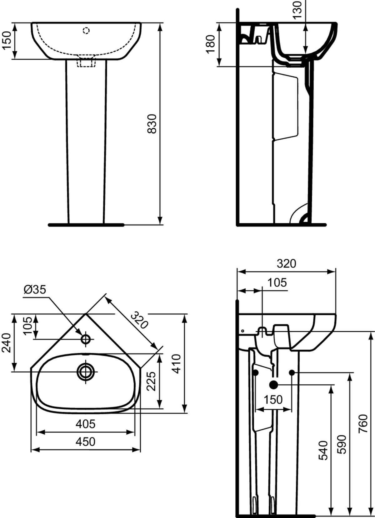 Νιπτήρας 45x41x15 γωνιακός, με υπερχείλιση με οπή στη μέση χωρίς κολώνα.